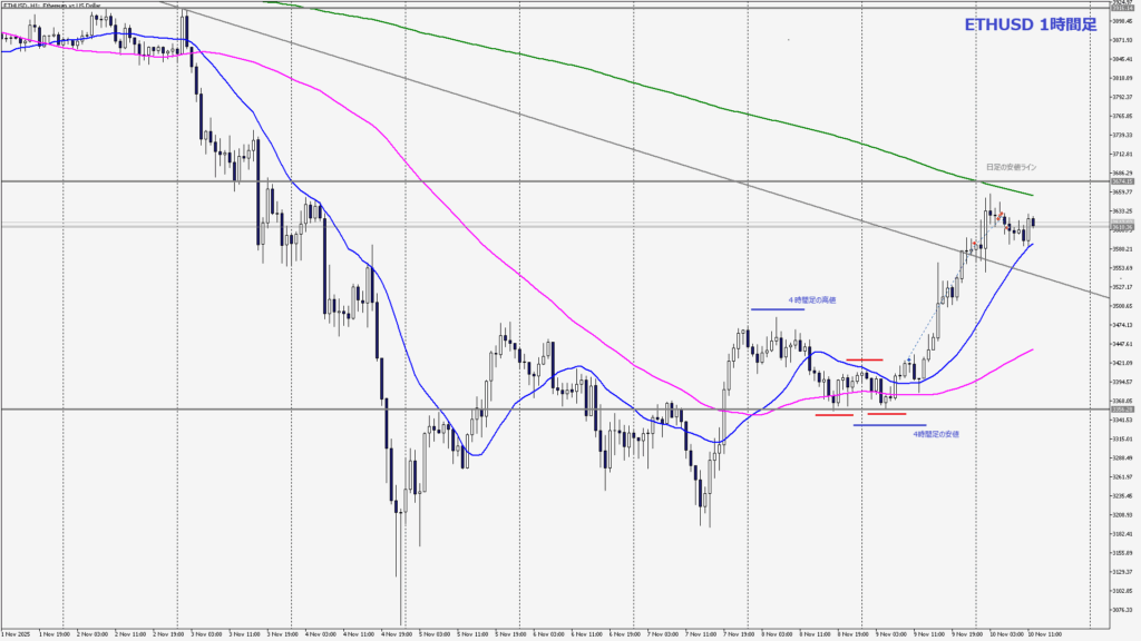 1時間足はWボトムを形成し、上昇トレンドに転換するポイント