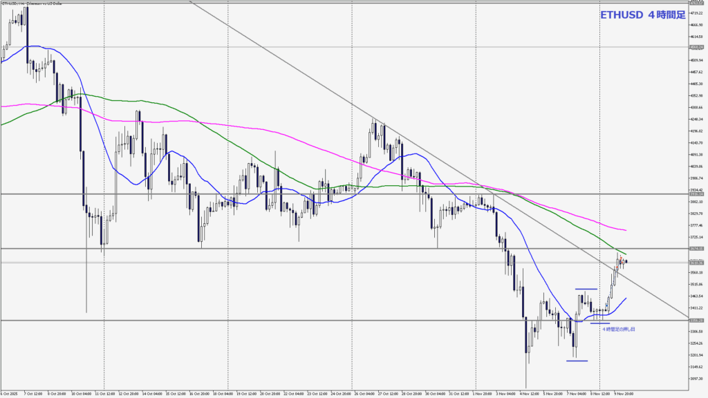 4時間足も下降トレンド中であったものの、安値を切り上げて高値もやや更新しており、買い勢力が多い状況